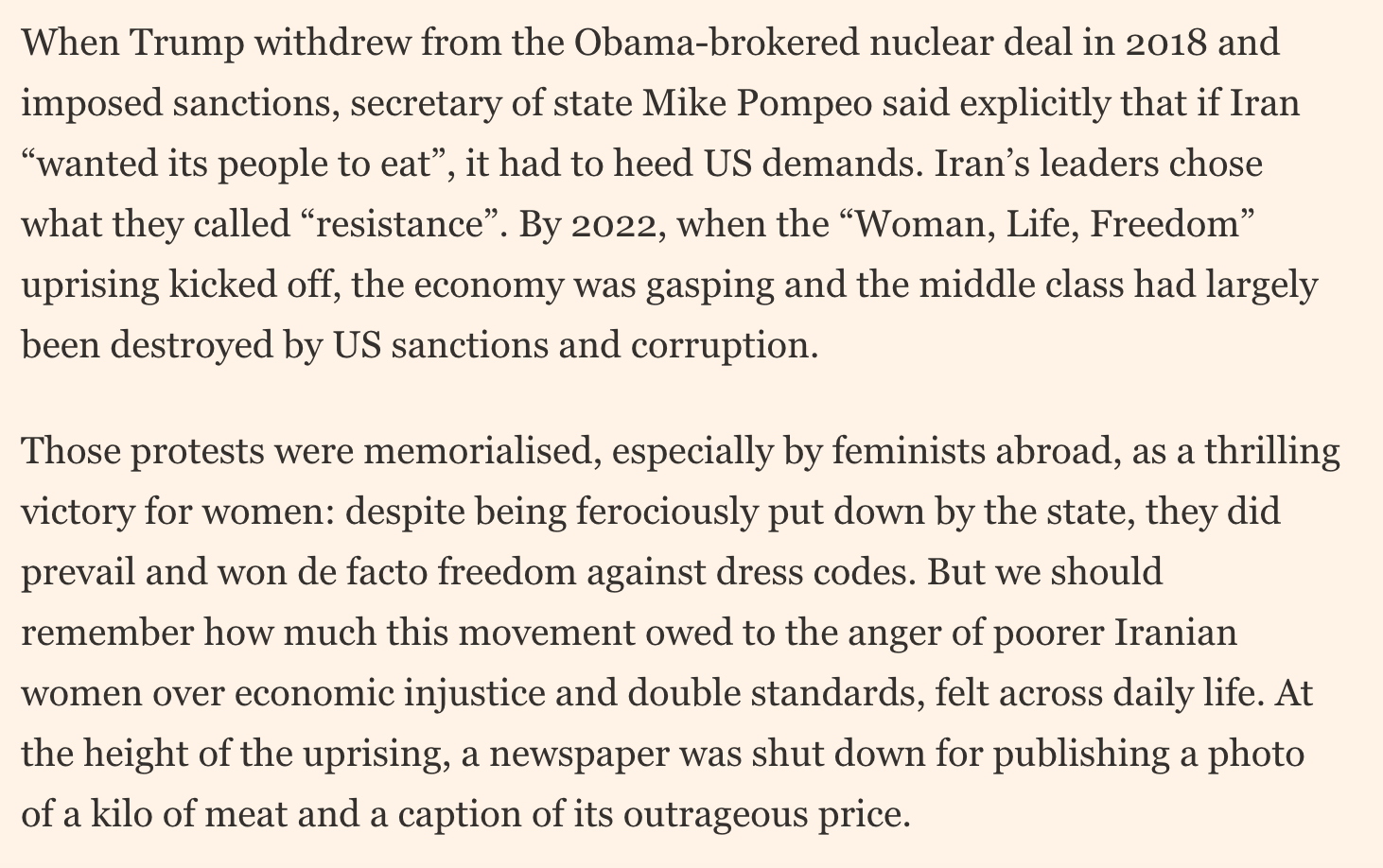 In Tehran I was helped out by a young Iranian-American journalist, Azadeh Moaveni. She has gone on to have a major career. This past weekend she had an excellent article in the Financial Times putting the last few weeks’ uprising into an economic context whose origins go back to the first Trump administration.